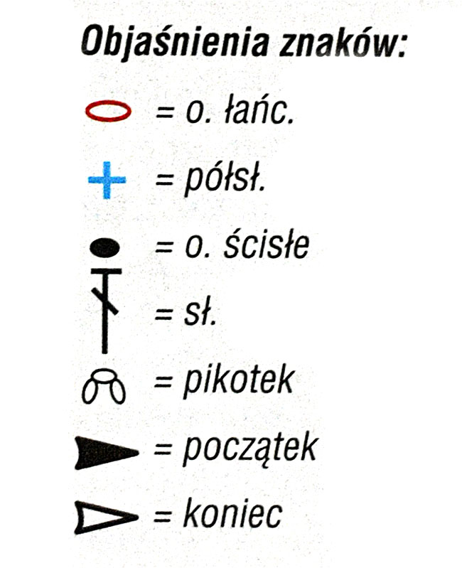 Dzisiaj uporzÄ…dkujemy sobie podstawy. Wpis doceniÄ… przede wszystkim bardzo bardzo poczÄ…tkujÄ…cy, którzy na widok schematu nawet prostej serwetki, dostajÄ… palpitacji serca. I mimo szczerej chÄ™ci szydeÅ‚kowania, znajdujÄ… sobie inne niby pilniejsze rzeczy do zrobienia, byle tylko nie musieć na TO patrzeć. Schemat rzeczywiÅ›cie może być na poczÄ…tku maÅ‚o czytelny, dlatego niektórzy wolÄ… instrukcje krok po kroku ile oczek, w którym rzÄ™dzie opisane sÅ‚ownie. Szczerze siÄ™ przyznam, że to na widok takich wÅ‚aÅ›nie instrukcji dostajÄ™ palpitacji serca i nie raz zdarzyÅ‚o mi siÄ™ rezygnować z tego powodu z wykonania danego wzoru. Chyba jestem wzrokowcem. Bo schemat od razu pokazuje mniej wiÄ™cej, jak bÄ™dzie wyglÄ…daÅ‚o gotowe dzieÅ‚o. I ja tak wolÄ™. Wystarczy wbić sobie do gÅ‚owy kilka podstawowych oznaczeÅ„, naprawdÄ™ kilka. I wiedzieć, że niektóre mogÄ… wyglÄ…dać nieco inaczej. Chodzi o to, że w niektórych schematach oczko Å›cisÅ‚e może być oznaczone jako „x”, a w innych jako pionowa kreseczka. Rada na to jest jedna, a wÅ‚aÅ›ciwie sÄ… dwie. – szukaj zawsze legendy do schematu. W dobrych czasopismach taka legenda jest przy każdym schemacie, a w jeszcze lepszych jest nawet instrukcja jak schemat wykonać. – jeÅ›li nie ma legendy zajrzyj do tego wpisu, bo tutaj zaprezentuje kilka legend z różnych czasopism. No i jest jeszcze jedna rada: – przed przystÄ…pieniem do wykonywania schematu, zanalizuj go dokÅ‚adnie, żeby wiedzieć, co CiÄ™ może spotkać. Po takiej analizie bÄ™dziesz wiedziaÅ‚a, jaka jest kolejność oczek, tzn. który znak odpowiada za oczko najniższe (oczko Å›cisÅ‚e, oczko Å›cisÅ‚e zamykajÄ…ce), a który za te wyższe (kolejno: półsÅ‚upek bez narzutu, półsÅ‚upek z narzutem, sÅ‚upek pojedynczy, podwójny itd.). Sprawa skomplikować siÄ™ może, gdy w schemacie wystÄ…piÄ… dziwne przerobienia nitki, gdy sÅ‚upki siÄ™ krzyżujÄ… albo trzeba przerabiać je w pÄ™czkach. Wtedy znowu rady sÄ… dwie i to nawet te same: najpierw zajrzyj do legendy pod schematem, a jeÅ›li jej nie znajdziesz – wracaj tutaj i szukaj instrukcji. No to czas na obiecane legendy. WyszukaÅ‚am w domu wszystko, co mogÅ‚oby siÄ™ przydać do tego wpisy. SÄ… to zdjÄ™cia gazet i ich legend. Do każdego podam źródÅ‚o i kilka uwag. Powyższa legenda pochodzi z mojej encyklopedii, którÄ… dostaÅ‚am od TeÅ›ciówki Mojej Jedynej i Niepowtarzalnej: „1000… splotów na drutach i szydeÅ‚kiem” G. Kowalskiej-Jarosz i K. Kleeman-Krasuskiej. Widać tu zarówno oczka podstawowe, jak i bardziej skomplikowane. Jednak z definicji można mniej wiÄ™cej wywnioskować, jak dane oczko należy przerobić. Legenda z „Damy w swetrze” nr 3-4/2013 SÄ… to podstawowe oczka i już widać, że ich oznaczenia różniÄ… siÄ™ od tych poprzednich. Oznaczenia z „SzydeÅ‚kiem i na drutach” nr 4/2010 Symbole podobne do „Damy”. Przy okazji widać, że to, co rzadziej wystÄ™puje jest od razu tÅ‚umaczone przy legendzie. Nie każdy wie, co to jest Å›cieg rakowy, dziÄ™ki tej legendzie już bÄ™dzie wiedziaÅ‚. Obie legendy pochodzÄ… z „MaÅ‚ej Diany – LubiÄ™ szydeÅ‚kować” nr 4/2013. Kolejny przykÅ‚ad na to, że dobrze opracowane schematy powinny mieć w legendzie instrukcjÄ™ wykonania trudniejszych oczek. W takich czasopismach zdarzajÄ… siÄ™ też czÄ™sto tutoriale fotograficzne z instrukcjami krok po kroku, jak wykonać co ciekawsze Å›ciegi. (po cichutku dodam, że w internecie też jest tego caÅ‚kiem sporo, wystarczy trochÄ™ pomyszkować). I jeszcze jedna niespodzianka. Ta legenda pochodzi dokÅ‚adnie z tego samego numeru, co dwie poprzednie. A sÄ… różnice!!! Dlatego zawsze zachÄ™cam do przejrzenia legendy i przestudiowania dokÅ‚adnie caÅ‚ego schematu przed rozpoczÄ™ciem robótki. Nie spotkajÄ… nas wtedy żadne niespodzianki już w trakcie dziergania. Dla ambitnych To jedna strona z legendÄ… z „Burdy – Koronki szydeÅ‚kowe” nr 1/2005. Może siÄ™ kiedyÅ› komuÅ› przyda. Å»yczÄ™ Wam tak skomplikowanych robótek, by siÄ™ przydaÅ‚a 🙂
