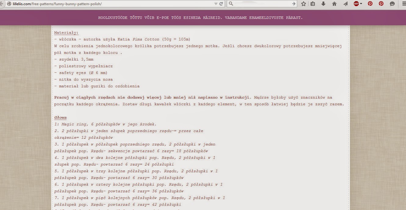 To jest druga część Tygodnia z amigurumi w Szkole SzydeÅ‚kowania. PoprzedniÄ… znajdziecie tutaj: DzieÅ„ 1. – przygotuj swój warsztat do amigurumi *** Zgodnie z wczorajszÄ… zapowiedziÄ…, dzisiaj bÄ™dzie o czytaniu opisów – i to od razu po polsku i po angielsku. Zaczniemy też naszÄ… pierwszÄ… maskotkÄ™ za pomocÄ… magicznego kółka (ang. magic ring). JeÅ›li dotÄ…d nie mieliÅ›cie przed oczami żadnego opisu wykonania szydeÅ‚kowej maskotki, musicie siÄ™ przygotować, że opisy sÄ…… różne. Niby zasady przerabiania oczek, ich dodawanie czy odejmowanie, sÄ… zawsze takie same, to ludzie siÄ™ jednak miÄ™dzy sobÄ… trochÄ™ różniÄ…. Dlatego to, co dla jednego jest dobrym i czytelnym opisem, drugiemu może przysporzyć już sporo trudnoÅ›ci. I dlatego też sposoby zapisywania instrukcji mogÄ… siÄ™ miÄ™dzy sobÄ… różnić. Postaram siÄ™ dzisiaj przedstawić główne zasady. Najpierw te, które powinny być przestrzegane. JeÅ›li tego w opisie nie znajdziecie, lepiej zostawcie go, szkoda nerwów. – Oznaczenia, czyli legenda. To ona jest pierwszÄ… rzeczÄ…, którÄ… należy przeczytać. DziÄ™ki niej wiemy, jakim systemem skrótów i oznaczeÅ„ operuje autor. Dopiero po uważnym przestudiowaniu legendy, jesteÅ›my w stanie powiedzieć, jakiego rodzaju oczek bÄ™dziemy używać, jak sÄ… oznaczone i czy w projekcie pojawiajÄ… siÄ™ rzeczy, których nie umiemy zrobić. W legendzie czÄ™sto znajdujÄ… siÄ™ również szczegółowe instrukcje, jak przerabiać nietypowe miejsca w projekcie (kilka oczek razem, szydeÅ‚ko wkÅ‚uwane tylko pod tylnÄ… nitkÄ™ oczka niższego okrążenia itp.). Czasami tÅ‚umaczenia te podawane sÄ… nie w samej legendzie, tylko dalej w opisie, w miejscu, w którym takie dziwne coÅ› pojawia siÄ™ po raz pierwszy. Zdarza siÄ™ też, że autor nie tÅ‚umaczy typowych skrótów, bo wedÅ‚ug niego sÄ… powszechnie znane. Przy okazji od razu napiszÄ™, że najczęściej wykorzystywane oczka w amigurumi to półsÅ‚upki bez narzutu, przez niektórych nazywane również oczkami Å›cisÅ‚ymi. Przerabia siÄ™ je spiralnie, tzn. nie zamykajÄ…c okrążeÅ„ oczkami Å›cisÅ‚ymi zamykajÄ…cymi. O nazwach oczek w różnych jÄ™zykach oraz jak je przerabiać, przeczytacie tutaj: Oczko Å›cisÅ‚e, sÅ‚upek, półsÅ‚upek – co to w ogóle jest i z czym to siÄ™ je? Skróty używane w obcojÄ™zycznych instrukcjach biorÄ… siÄ™ zazwyczaj od pierwszych liter nazw danych oczek (np. sc to single crochet, czyli półsÅ‚upek, hdc to half double crochet, czyli półsÅ‚upek z narzutem). O różnym nazywaniu tych samych oczek (również w ramach jednego jÄ™zyka) możecie przeczytać tutaj: PorzÄ…dek w podstawach – oznaczanie oczek na schematach Wracamy do tego, co jeszcze powinno znaleźć siÄ™ w instrukcji. – Liczby porzÄ…dkowe kolejnych okrążeÅ„. Bez tego zginiemy po przerobieniu pierwszych dwóch. W każdej chwili musimy mieć pewność, które okrążenie aktualnie przerabiamy. OczywiÅ›cie dobrym zwyczajem jest używanie znaczników na poczÄ…tku okrążenia. Chyba że lubicie poczuć lekki dreszczyk emocji 🙂 Ja nie używam w amigurumi znaczników – po prostu mi przeszkadzajÄ…, ale raczej nie bierzcie ze mnie przykÅ‚adu w tej dziedzinie, zwÅ‚aszcza na poczÄ…tku. Zamiast znacznika można użyć agrafki, spinacza, a nawet kawaÅ‚ka włóczki w kontrastowym kolorze (ale bez wÅ‚osków). – Liczby oczek po zakoÅ„czeniu każdego okrążenia (w nawiasie lub po znaku równoÅ›ci). To dobra praktyka, choć nie wszyscy te liczby podajÄ…. A szkoda, bo kiedy widzimy, że po przerobieniu wszystkich oczek w danym okrążeniu powinno być tych oczek 36, a w tym naszym mamy 37, to znak, że coÅ› siÄ™ dzieje! 😀 Å»e gdzieÅ› zrobiliÅ›my błąd i już na tym etapie możemy coÅ› poprawić, by dalej zabawka wychodziÅ‚a dobrze. W wiÄ™kszoÅ›ci instrukcji autorzy podajÄ… również nazwÄ™ włóczki i rozmiar szydeÅ‚ka. Jeżeli chcecie otrzymać dokÅ‚adnie takÄ… samÄ… maskotkÄ™, jakÄ… zaprezentowaÅ‚ autor, możecie siÄ™ tych wytycznych trzymać. Ja jednak najczęściej robiÄ™ z tego, co mam akurat w domu; ewentualnie dokupujÄ™ tylko brakujÄ…cy kolor. Amigurumi i jego drobne elementy sÄ… idealne do wykorzystywania koÅ„cówek włóczek. JakiÅ› drobny kwiatek, buty, czy ozdobny brzeg sukienki – to idealne miejsca, w których koÅ„cówki siÄ™ sprawdzÄ…. Warto jedynie pamiÄ™tać, by włóczki użyte w ramach jednego projektu byÅ‚y choć podobnej gruboÅ›ci. Czytanie instrukcji amigurumi Poniżej zamieszczam screeny kilku opisów (oczywiÅ›cie darmowych) znalezionych w sieci. Każdy jest skonstruowany inaczej. Do każdego trzeba innego podejÅ›cia, ale jeÅ›li przeanalizujemy je razem, to już żaden inny nie powinien Wam sprawić trudnoÅ›ci. (Pod każdym zdjÄ™ciem zamieszczam link do strony, z której opis pochodzi, ponadto wszystkie zrzuty ekranu można powiÄ™kszyć). Na poczÄ…tek polski opis na króliczka http://lilleliis.com/free-patterns/funny-bunny-pattern-polish/ Widać, że autorka tÅ‚umaczenia postaraÅ‚a siÄ™, by instrukcja byÅ‚a naprawdÄ™ czytelna. Praktycznie nie używa skrótów na oznaczenie poszczególnych oczek. Traci na tym nieco „zwartość” instrukcji, która zabiera nieco wiÄ™cej miejsca. Jednak dziÄ™ki tak przedstawionemu opisowi, nawet poczÄ…tkujÄ…cy sobie poradzÄ… z jej odczytaniem. Widzimy, że sÄ… podane numery okrążeÅ„, a po znakach równoÅ›ci na koÅ„cu każdego okrążenia jest liczba oczek, którÄ… powinniÅ›my osiÄ…gnąć. W samej legendzie nie ma listy oczek i ich oznaczeÅ„, ale nie jest to potrzebne, bo autorka nie stosuje skrótów. Kolejna instrukcja jest również po polsku. h
